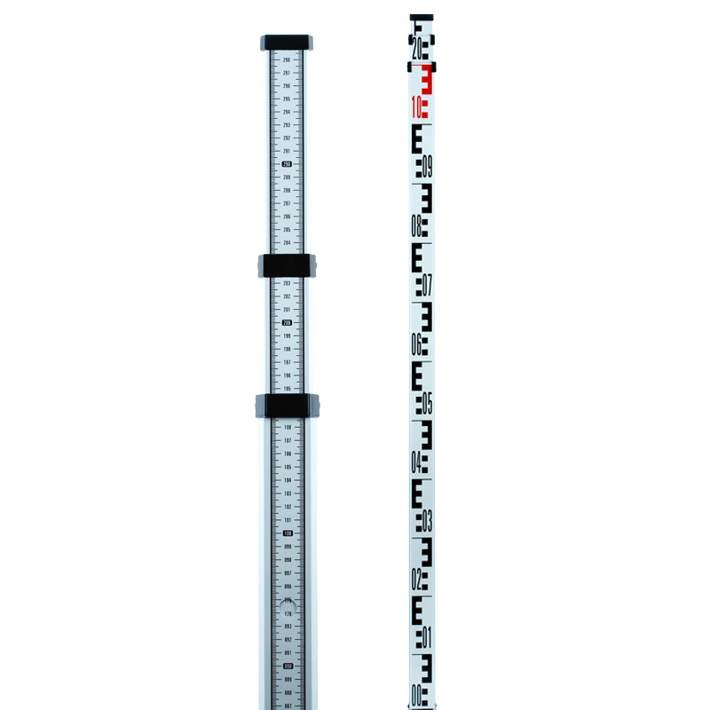 Стандартная красно/черная градуировка "Е" с лицевой стороны и миллиметровая шкала с нулем на нижней части нижней секции нивелирной рейки с другой стороны (Шкала идет по всем секциям снизу вверх).